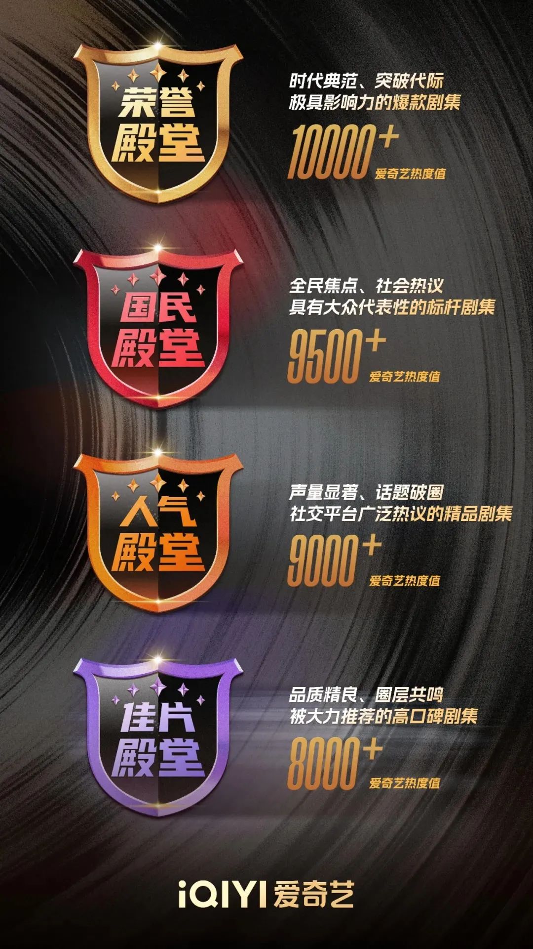 昨日,爱奇艺基于平台内容热度值推出了“剧集四大殿堂”体系,将内容热度8000+至10000+的剧集划分进入殿堂,并给予专属荣誉标识。