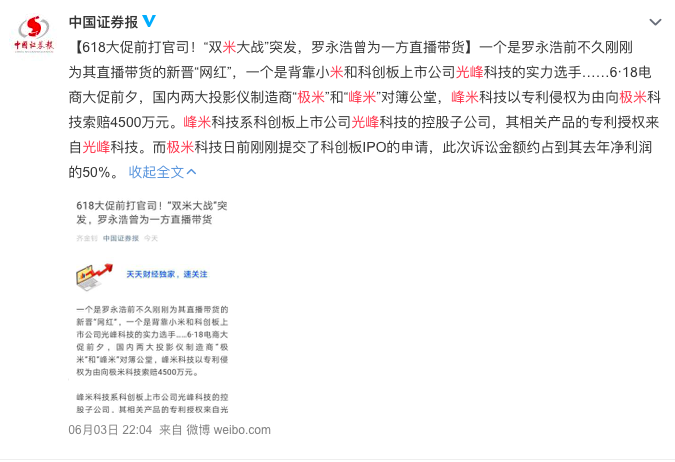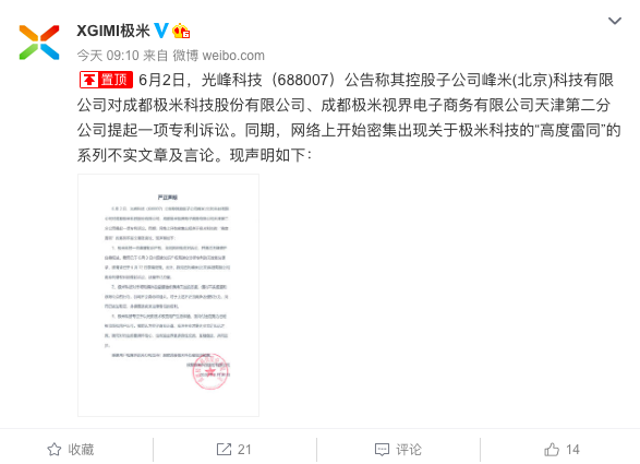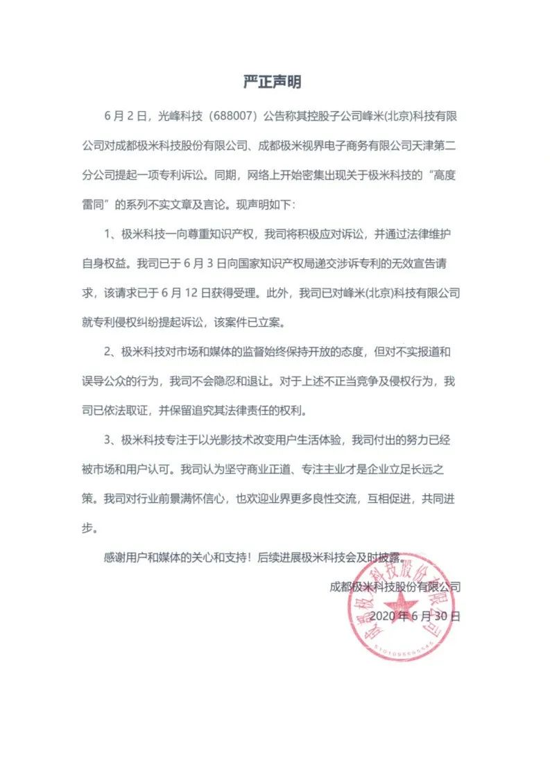 6月30日,极米在其官方微博发布声明,重要传递了2个增量信息:一是已对光峰科技进行专利反诉,二是对媒体的不实报道已依法取证并保留追究法律责任的权利。