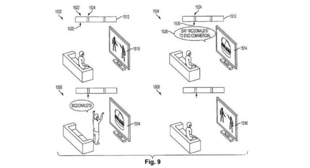 索尼最近申请了一项非常有趣的专利,在看电视的时候如果出现了广告,只要你站起来大喊对应品牌的名字,就可以跳过这个广告。索尼将这项专利描述为“将电视广告转换成交互式网络视频游戏的系统”。就像图中所演示的那样,当你在观看喜欢的电视剧时,突然出现了麦当劳汉堡的广告,只要站在客厅大举起双臂大喊“麦当劳“,就像篮球裁判宣布得分有效一样,接着广告就会自动关闭,你可以坐下继续看原来的电视节目。