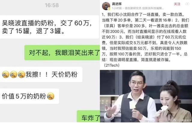 6月29日晚,吴晓波首次在淘宝直播带货“新国货首发”翻车,有媒体表示,60万的坑位费,当天卖出15罐奶粉,第二天退货3罐,被网友笑称天价营销费用,而后,吴晓波方面发布声明表示部分媒体报道失实,并要求删除相关报道稿件,但“翻车”事件并未落下帷幕,众多网友热议不断。