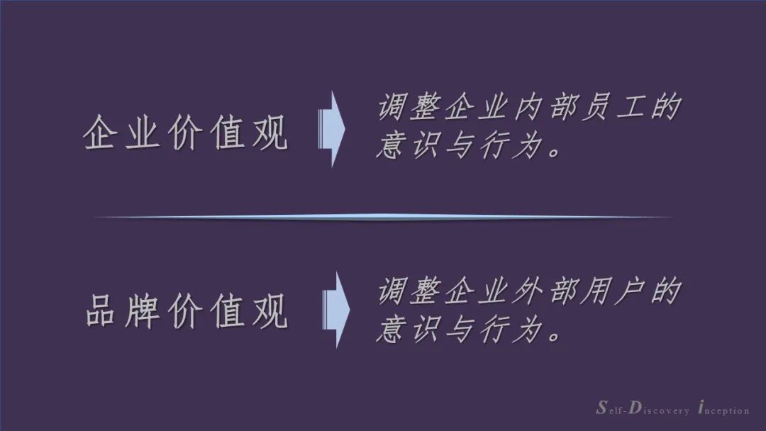 总结来说:企业价值观要调整的是企业员工的意识与行为,从而确保基业长青;而品牌价值观则是要调整目标用户的意识与行为,从而确保在用户心中建立起一个卓尔不群的强大品牌,并持续影响用户的行为模式。