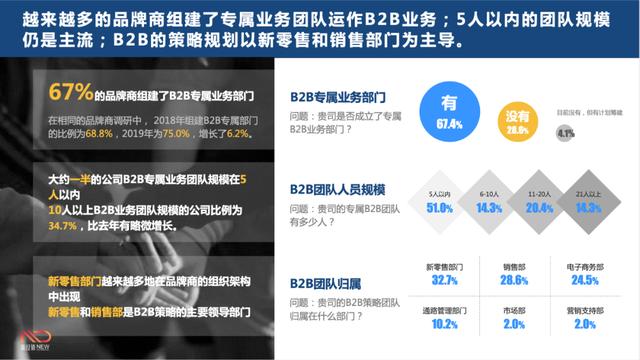 最新报告调研数据显示,当前约有67%品牌商组建了B2B专属业务部门,归属新零售或销售部门主导。从人员数量的匹配上看,一半以上都是5人编制以内。相对来说,团队规模有限,当然,这也与生意占比有关。