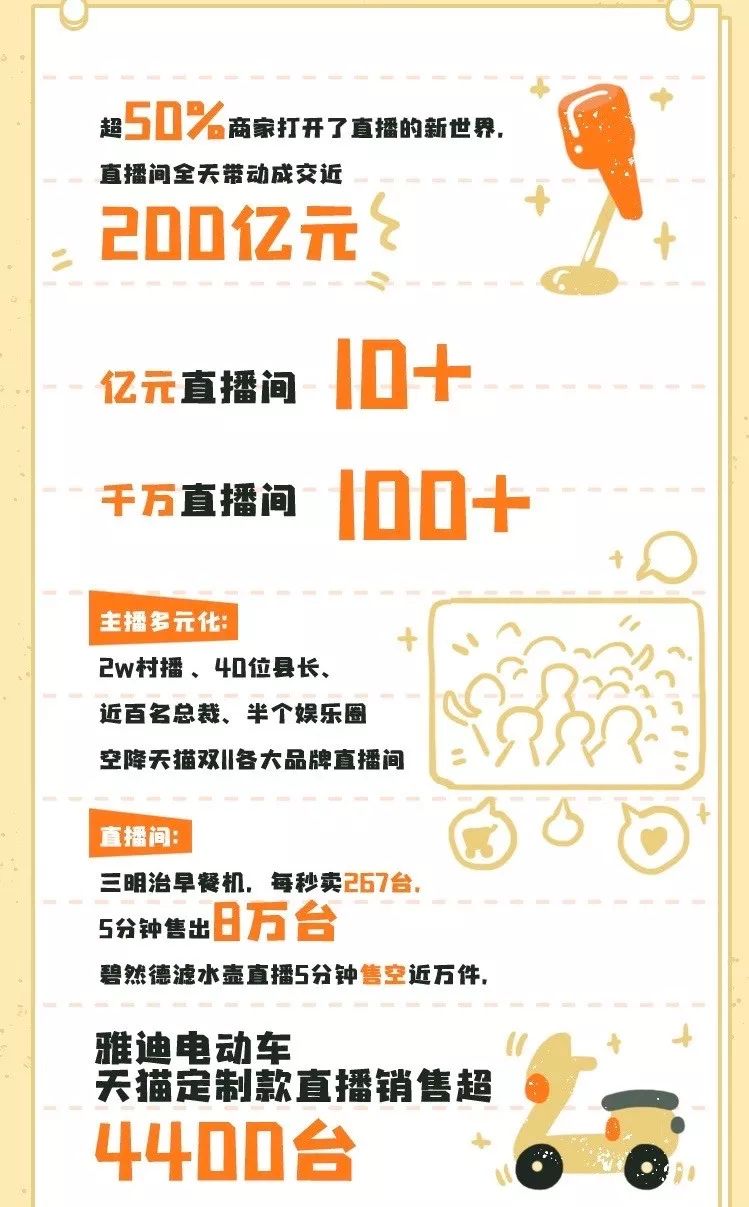 数据说超过50%的商家在双11开了直播,全天带动成交近200亿,卖货过亿的直播间超过10个,过千万的直播间超过100个。同时,直播主播在多元化,包括2万农民,40位县长,超过100名总裁空降直播间,当然还有还多明星也在参与。