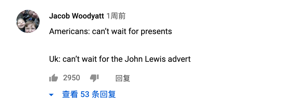 美国人: 等不及要收圣诞礼物了! 英国人: 等不及看要看John Lewis的圣诞广告了! / 图为油管上John Lewis 2019 圣诞广告的最热评论