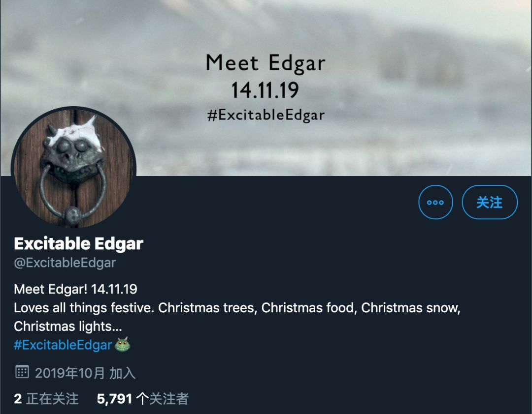 John Lewis为这支广告投入的资金高达 700万英镑 ,不仅创造了Edgar小火龙这个憨憨的原创角色,他们甚至还将发布广告的日子定为Edgar的生日,给他开通了Twitter账号: