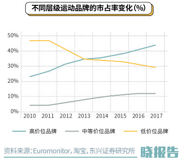 以往“价升量减”被视作一种必然的商业规律,但如今,以增长型客群为依托,很多品牌商提价后,其市占率、营收和利润数据表现反而更佳,实现“量价齐涨”的双赢。以运动品牌为例,近几年,低价位品牌的市占率逐年走低,向高端化转型、高价品牌的市占率增长趋势明显。