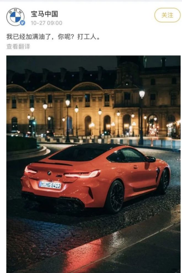10月27日,宝马po出一张跑车靓照,配文:我已经加满油了,你呢?打工人。