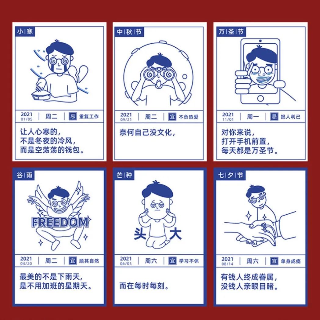 灵感来源于民间传统的老黄历,在现代习惯的基础上,融合了古代农历历法。