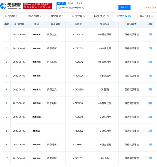 已申请“奶茶妈咪”“奶茶宝宝”“奶茶宝贝”等多个商标