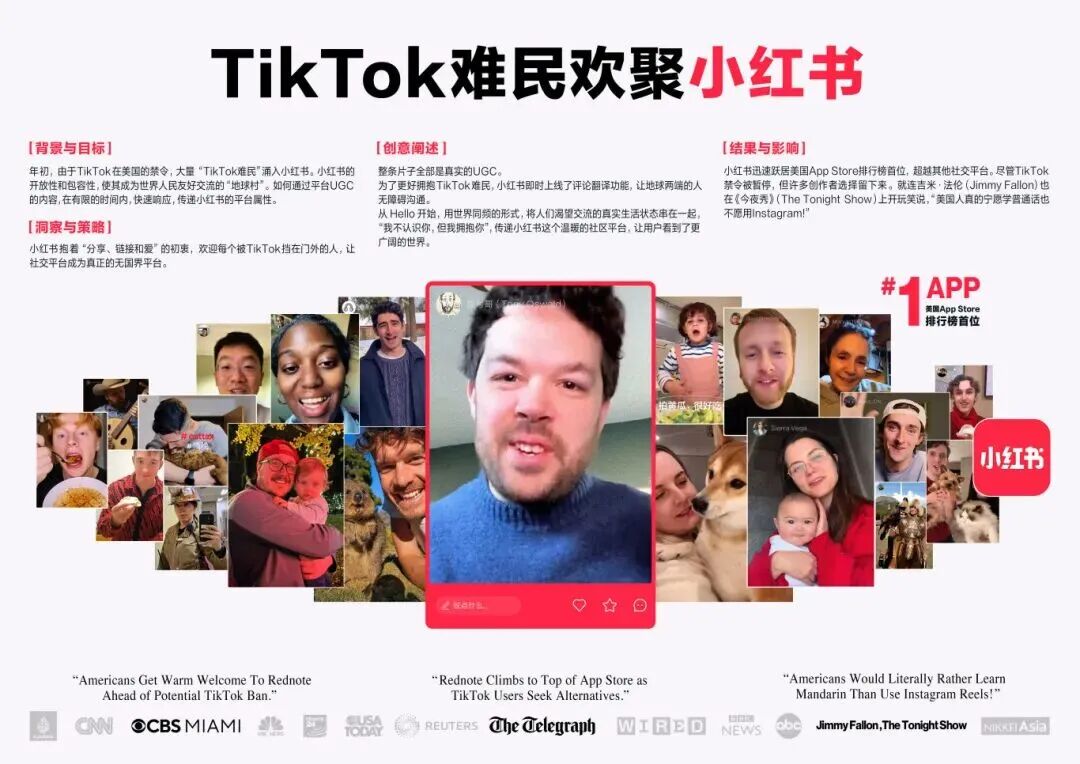 入选理由 :展现了“我不认识你,但我拥抱你”的态度与观点,传递小红书这个温暖的社区平台让用户看到了更广阔的世界。从“承接泼天流量”到“主动借势营销”,此次营销精准地承接了全球用户的情绪,将一次用户迁徙的突发事件,转化为一场小红书的“品牌形象升级工程”。期间,小红书迅速跃居美国App Store排行榜首位,超越其他社交平台。后续尽管TikTok禁令被暂停,但依然有许多创作者选择留在了小红书。