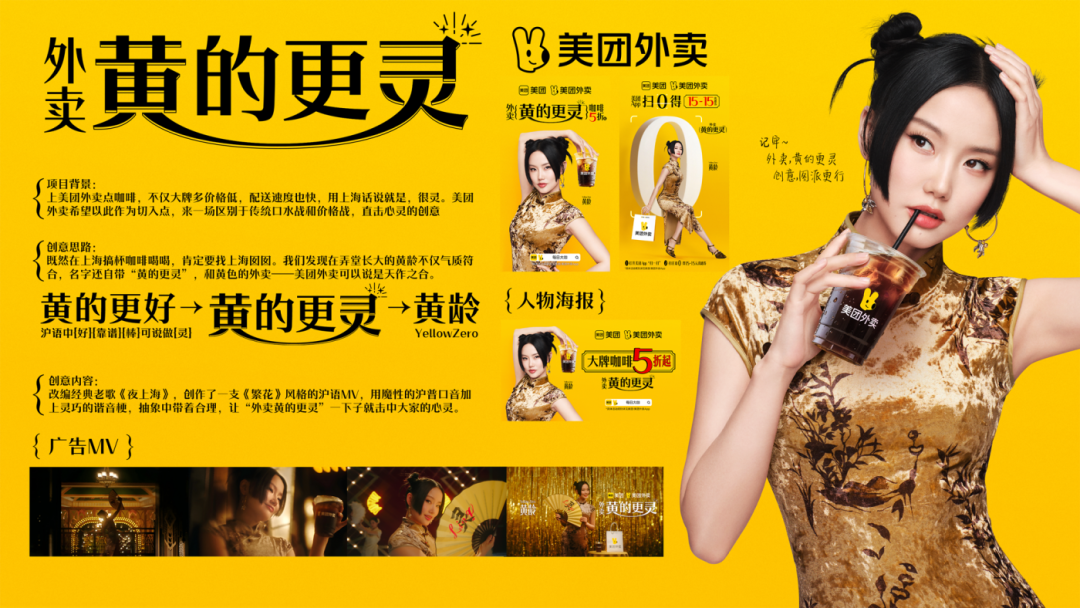 案例简介 :2025年初,京东外卖的高调上线打破了外卖市场的平静局面,引发三大外卖平台之间的博弈。美团外卖敏锐捕捉到上海方言中“灵=好、靠谱”的内涵,结合品牌标志性的“黄”色及明星黄龄名字的谐音,提炼出品牌传播核心——“黄的更灵”,推出广告片《外卖,黄的更灵》及相关海报物料,帮助品牌在心智战中抢占更多消费者关注。